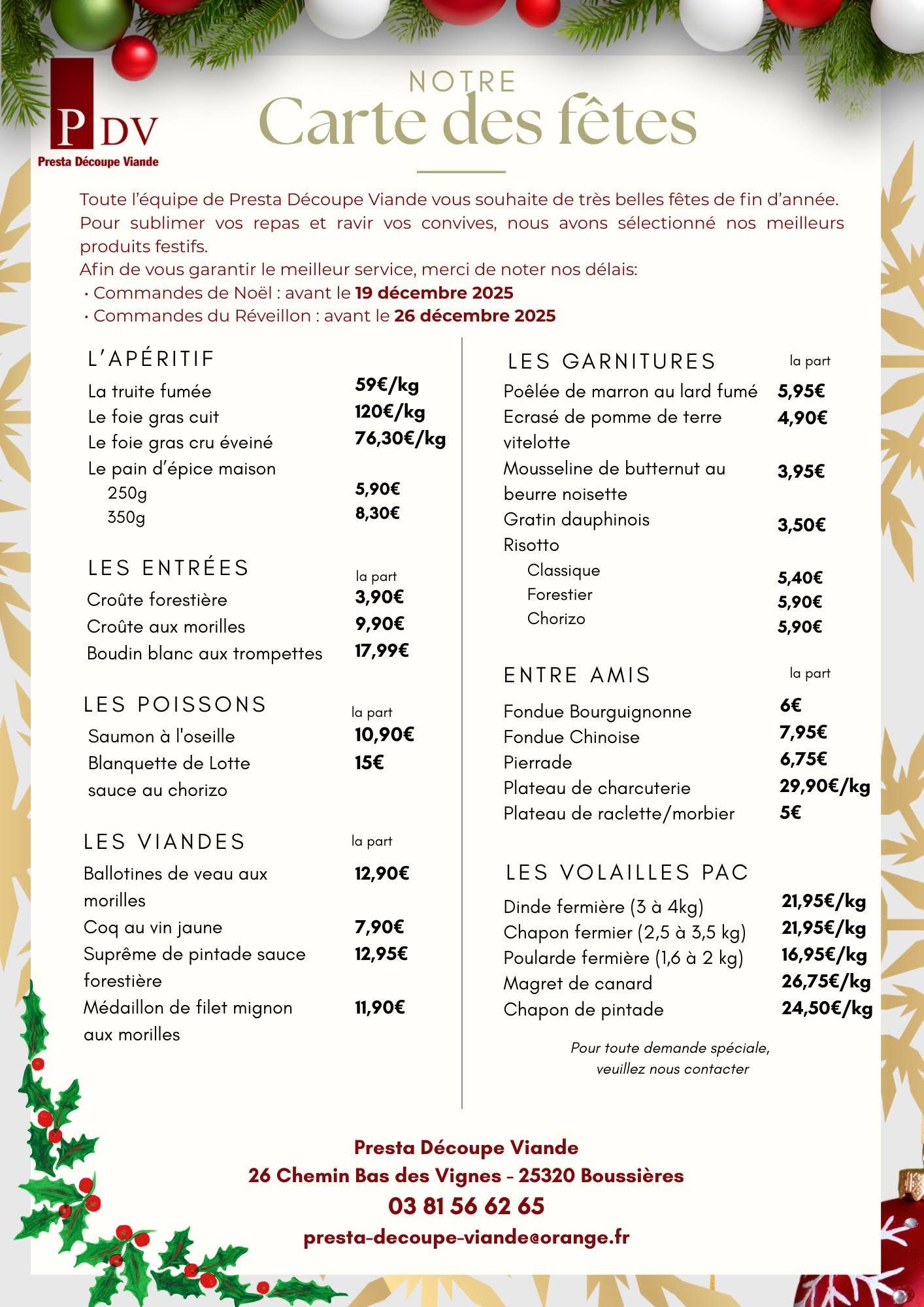 À l’occasion des fêtes de fin d’année 2025, la Boucherie Presta Découpe Viande a proposé une carte festive complète, mêlant repas traiteur, préparations artisanales et viandes d’exception. Retour sur cette période gourmande.